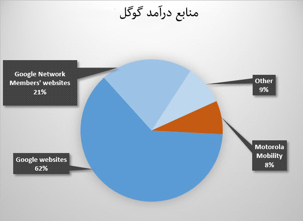 شاید گمان کنید که گوگل بیشتر درآمدش را از طریق موتور جستجوی معروف خود کسب میکند اما دو سال پیش، گوگل یک شرکت تک کار بود که تمام درآمدش تقریباً از تبلیغات به دست میآمد. بر اساس گزارش سالانه این شرکت در سال ۲۰۱۱، «۹۷ درصد درآمد شرکت ما در سال ۲۰۰۹ و ۹۶ درصد در سال ۲۰۱۰ و ۲۰۱۱ از تبلیغات به دست آمده است». این تصویر به مرور که گوگل تلاش کرد تا از طریق خرید موتورولا به عرصه سختافزار وارد شود، تغییر کرد. اما فروش اخیر موتورولا به شرکت لنوو، تقریباً همه چیز را به حالت پیشین بازمی گرداند. بخش «درآمدهای دیگر» که شامل محصولات دیجیتال و محصولات سخت افزاری غیر موتورولا است، بخش ناچیزی از درآمد شرکت گوگل را تشکیل میدهد. بعد از فروش موتورولا به لنوو، درآمد گوگل از تبلیغات به بیش از ۹۰ درصد برمی گردد.